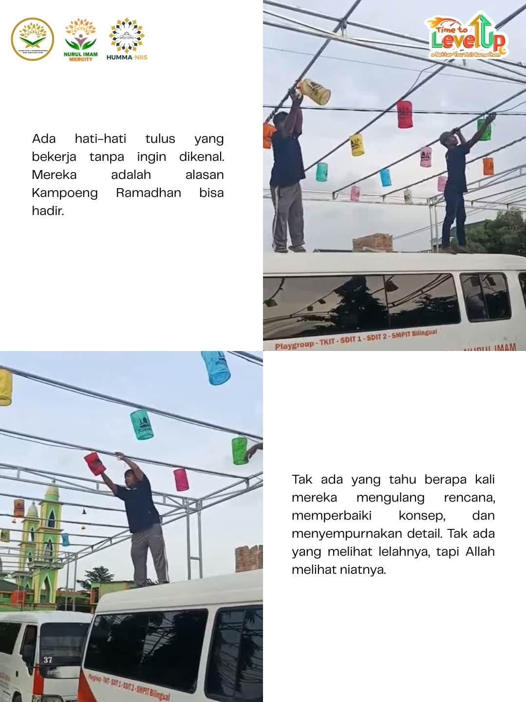 Yang kamu lihat nanti hanyalah hasilnya. Tapi yang jarang terlihat adalah prosesnya. Tangan-tangan sibuk menata, kaki yang tak lelah bolak-balik, pikiran yang terus mencari solusi. Di balik Kampoeng Ramadhan ada tim yang bekerja tanpa sorotan, tapi penuh dedikasi. Kampoeng Ramadhan disiapkan dengan perencanaan matang, kerja tim yang solid, dan semangat yang sama.